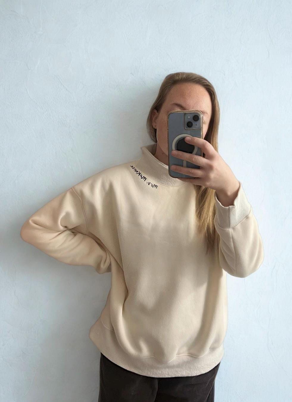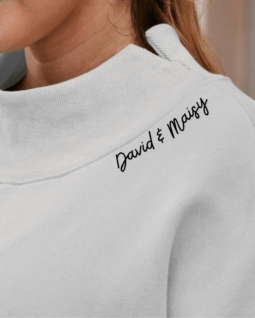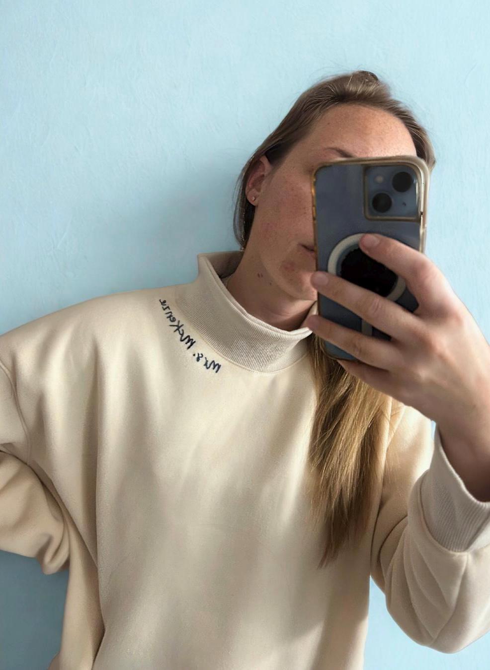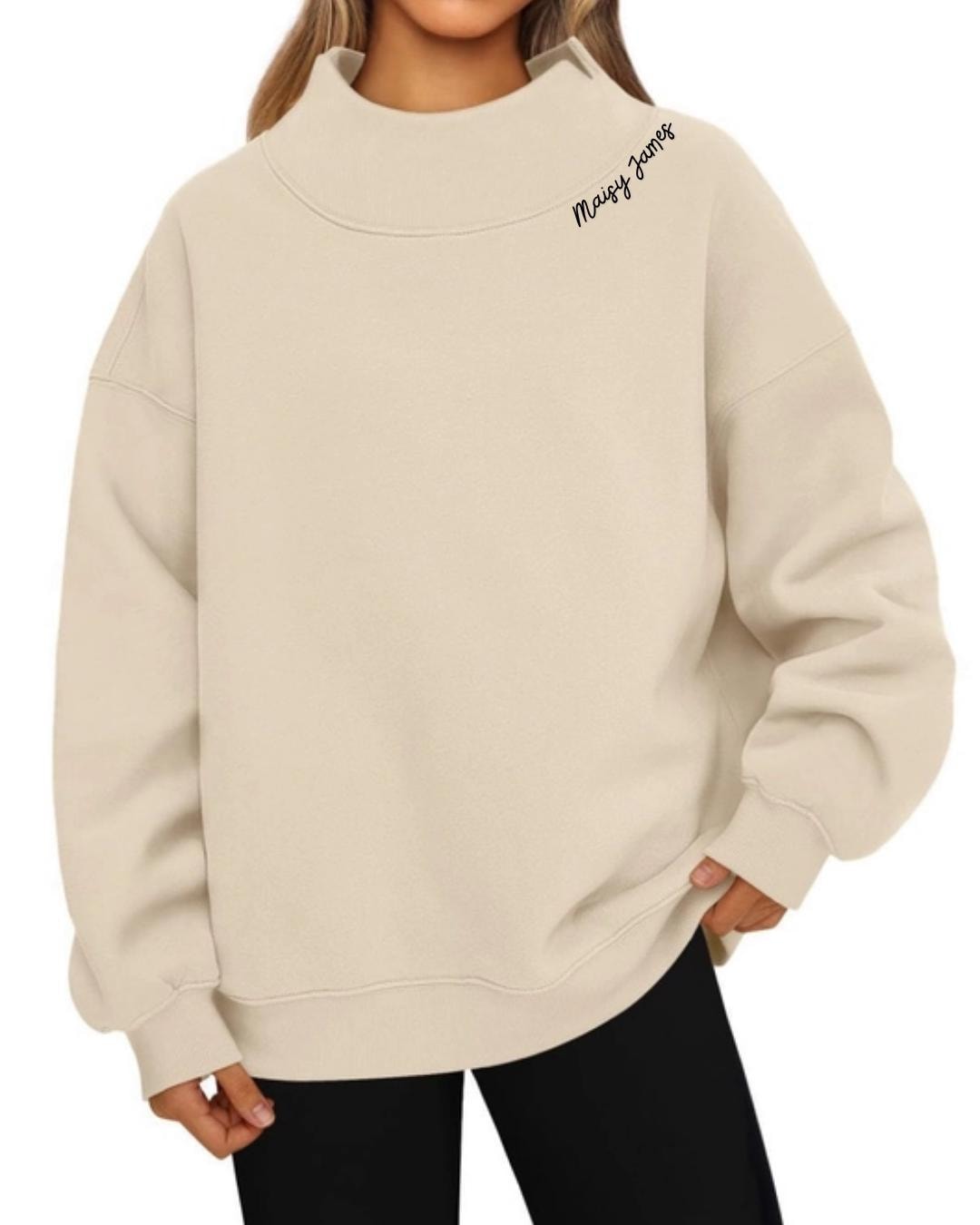 Cozy, oversized, and totally you. This elevated mockneck sweatshirt is the perfect blend of comfort and style — with a delicate, embroidered detail along the neckline, left chest, or in the center the adds a personal touch. Add a sleeve detail on the right cuff to make it extra special. Each piece is customized just for you, featuring a dainty embroidery of your choice — think your name/teacher name, school, sorority, bride-to-be title, maid of honor, business logo, or any word that’s special to you.