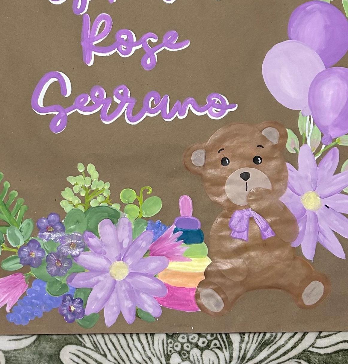 🌸 Hand-Painted Personalized Baby Name Banner | Custom Floral Teddy Bear Wall Art